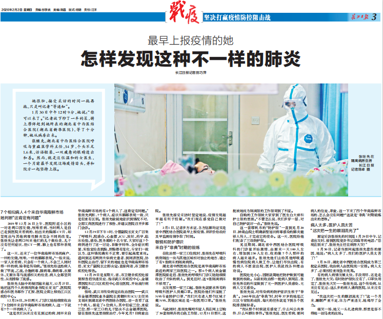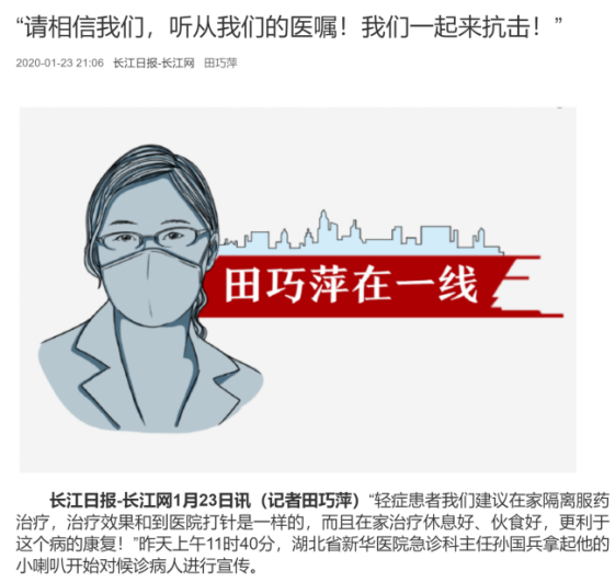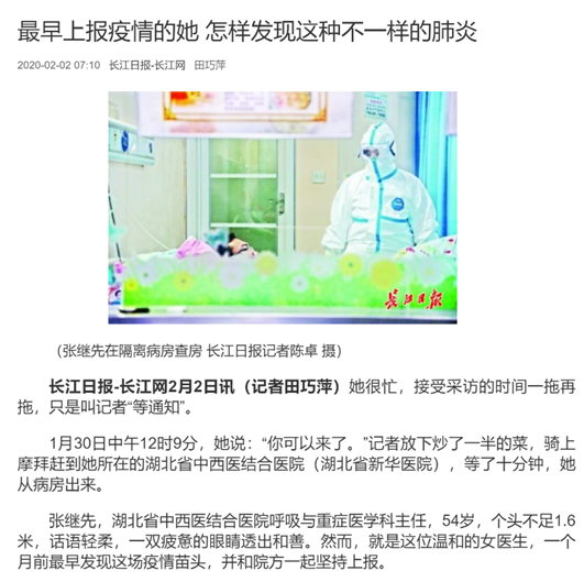 图3:《最早上报疫情的她,怎样发现这种不一样的肺炎》,图片来源:长江日报-长江网http://www.cjrbapp.cjn.cn/p/156527.html