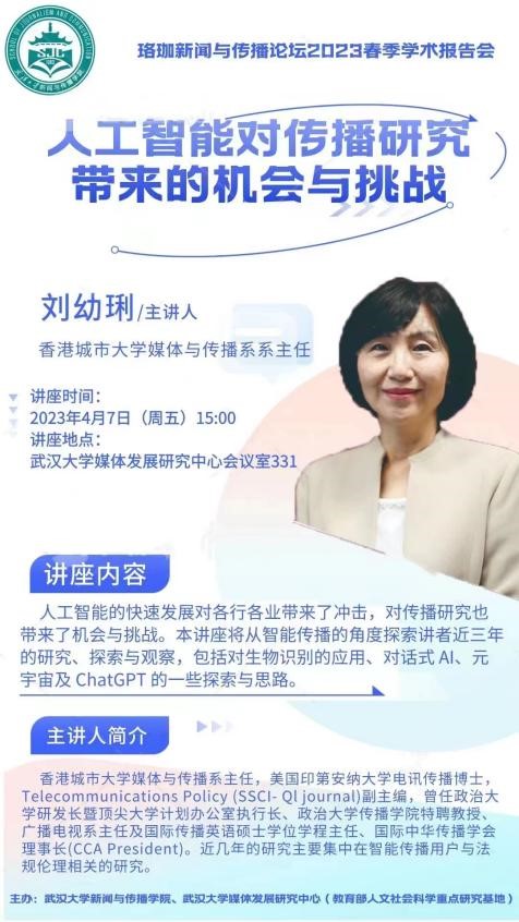 随后,刘幼琍教授在MS88官方网站媒体发展研究中心331会议室,开讲题为《人工智能对传播研究带来的机会和挑战》的讲座。讲座由吴世文教授主持。