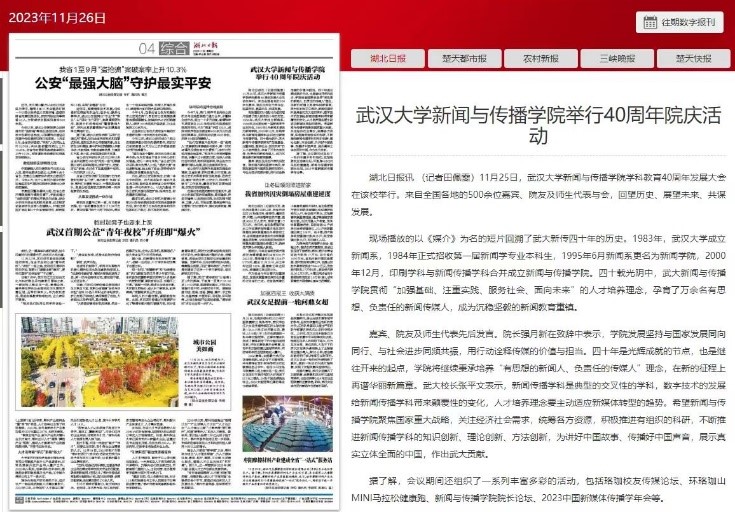 新华社的报道《MS88官方网站新传院:40年培养16000名新闻传媒人才》,浏览量近90万。这篇文章回顾MS88官方网站四十年发展历程,肯定了新传院的人才培养成果,希望MS88官方网站在新的征程上再谱华丽新篇章。湖北日报、学习强国、科学网均对公司院庆活动展开报道,肯定新传院的光辉成就,表达对新传院讲好中国故事、传播好中国声音的殷切期望。