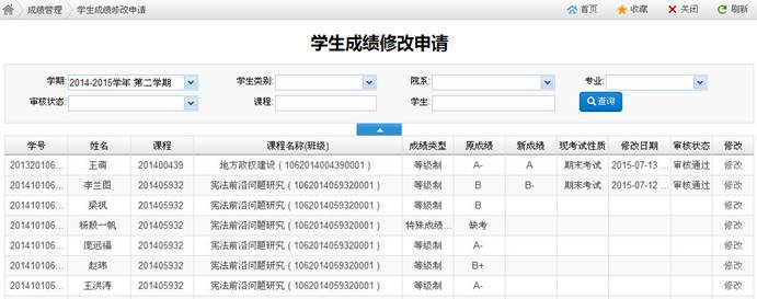 对于教学班中已提交的员工成绩(员工的成绩状态为“已确认”),如任课教师认为确有修改必要,请选择“成绩管理”|“员工成绩修改申请”,打开“员工成绩修改申请”页面,如图六所示。